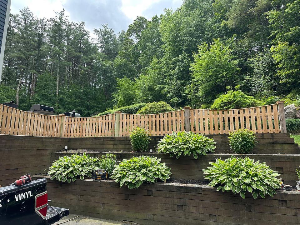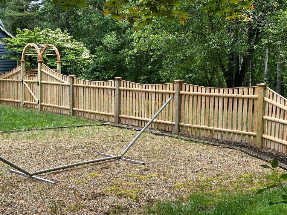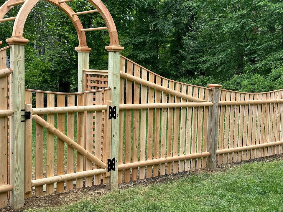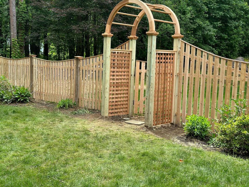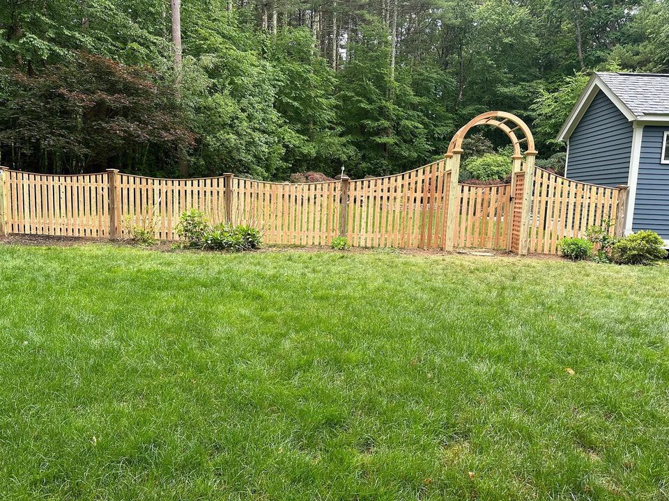 Melo installed a stunning combination of 4-foot and 3-foot high cedar spaced picket fencing, beautifully intertwined with an arbor that features square lattice sides. This harmonious blend of fence and arbor enriches our portfolio with its bespoke craftsmanship and allure. Inspired to add such a distinctive element to your landscape? Reach for a free estimate and let’s collaborate.